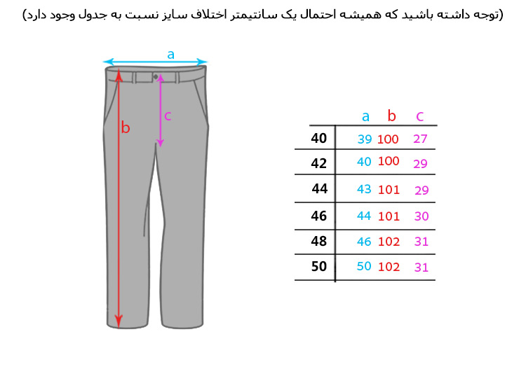 داشتن شش رنگ متفاوت با سایزبندی کامل از دیگر ویژگیهای شلوارهاست که موجب امکان انتخاب بیشتر میشه و مثل همیشه از کاربرای عزیز خواهش میکنیم قبل از خرید حتما به جدول اندازهها دقت کنند.