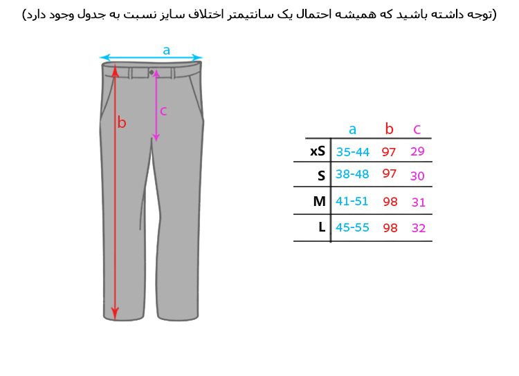 سلام، متاسفانه شلوار سایز استاندارد نداره، فاقش خیلی کوتاه، اما قد شلوار خیلی بلند و گشاد، مثلاً من سایزم ۴۴ سایز لارج گرفتم اما بزرگه و یااسمال برای سایز ۴۰ یا ۴۲ خوب باشه، امیدوارم راهنمایی برای دوستان باشه، اما جنس و دوختش زیباست